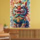 This poster is a vibrant and colorful illustration of a mythical creature, likely a Okinawan Guardian Lion (often called Shisa) or a representation of a Lion Dance mask/costume.