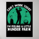 Esta ilustração humorística com o tema do golfe apresenta um círculo verde angustiado que se assemelha a um verde de golfe, no interior do qual é visível uma silhueta preta de um golfe a balançar o médio e um saco de golfe. Uma bola de golfe e uma bandeira estão no verde, com o fundo da camisa sendo preto. O texto "NÃO CONSEGUE TRABALHAR HOJE" é mostrado em branco na parte superior, enquanto "ESTOU SENDO UM POUCO ABAIXO DO PAR" é exibido abaixo em branco, com um faixa verde em relevo "SOB PAR". A design joga no termo de golfe "abaixo do par" para explicar com humor o desejo de evitar o trabalho.