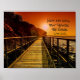 O poster bonito descreve o sol de ajuste sobre uma ponte de madeira cercada pelo mar e caracteriza o 22:42 de Luke do verso da bíblia.