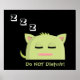 Uma ilustração fofa e engraçada de uma personagem de gatinho dormindo. Verde colorido com orelhas pontiagudas e pequenos tufos de cabelo em cima de sua cabeça com lábios rosa sem expressão e uma cauda pontiaguda. Olhos fechados, dormindo solidamente e roncando com Zz acima da cabeça. Não perturbe.