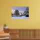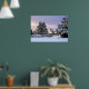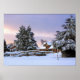 Uma bela cena de neve de inverno com cartão de Natal. Esta foi uma foto que tirei no início da manhã enquanto o sol era ascensão. Isto proporcionou um céu dramático e colorido que realmente melhora esta cena da neve. O prédio coberto de neve com uma ponte a partir dele cercado por neve coberta por vergreens pinta um quadro perfeito. A lâmpada antiquada é o toque final e completa o quadro. Escolha seu tamanho de poster básico para impressões e canvas de arte. Uma opção de quadro também está disponível.