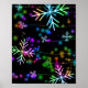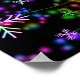 Natal caindo várias cores neonatais flocos de neve SlipperyJoe presentes de orgulho gay artísticos LGBTQIA fundo escuro vibrante inverno ilustração digital colorida azul verde cor-de-rosa cor-de-rosa piscando luzes vivas festivas dimensões de profundidade penduradas linhas negras fundo preto
