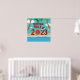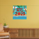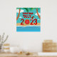 A ilustração do Natal de julho de 2023, com o número vermelho do ano 2023, decorado com corrente luminosa colorida, melancia fatiada e chapéu vermelho de Papai Noel. Exibido na praia com palmeiras e água oceânica.