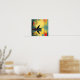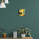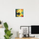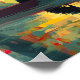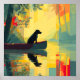 Um Labrador preto sentado pacificamente em uma canoa, cercado por uma paisagem quente e radiante.