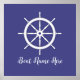 Ilustração da roda do navio em detalhes brancos e azuis escuros em um fundo azul com texto abaixo para você personalizar o nome do seu barco.