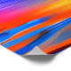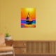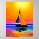 Poster num veleiro vibrante com velas coloridas que atravessam a água, refletindo as incríveis matizes de um pôr do sol radiante. O céu e o mar criam uma mistura hipnotizante de tons laranja, amarelo, azul e coral