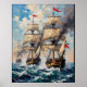 Esta pintura captura uma cena dramática de dois navios altos de velas lutando contra um mar agitado e turbulento. A obra de arte apresenta uma técnica de impasto pesado, com pinceladas grossas e expressivas que dão às ondas uma qualidade escultural e tridimensional. Os navios, com suas velas cheias e bandeiras vermelhas, são colocados contra um céu turbulento cheio de nuvens tempestuosas. A composição geral evoca um senso de aventura e o poder da natureza.