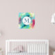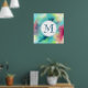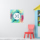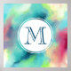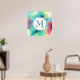Um poster com um design legal e na moda abstrato. As aquarelas se misturam e se misturam para criar a ilusão de uma imagem espacial. Verde com espirais de púrpura, amarela e vermelho-claro misturados com uma mistura de pontos brancos e estrelas. Uma criação artística elegante. Um círculo branco colocado sobre o topo com um dentro inicial de monograma.
