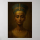 This poster features a vintage-style painting of Nefertiti (1370 - 1333 BC), an original face-on portrait of the Egyptian queen of the 18th Dynasty of Ancient Egypt, and royal wife of Pharaoh Akhenaten. The colors are muted, and the painting has an overall textured look. She wears simple knob earrings, an elaborate headpiece, and layered necklace.