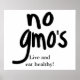 Promover comidas saudáveis e viver sem produtos de ogm. Expresse a sua opinião sobre as comidas geneticamente modificadas e os riscos para a saúde associados a estas comidas. Este poster é perfeitamente personalizável com as palavras "no gmo's" em texto negro e em negrito sobre fundo branco para chamar a atenção. As palavras personalizáveis "Live and Eath Healthy" são escritas na parte inferior. Excelente de eventos e reuniões para promover comidas seguras e o ambiente. As comidas de OGM são proibidas na União Europeia, mas são vendidas nos EUA sem rotulagem. Mostre os seus sentimentos e preocupações dizendo "Não há OGM". Alguns estados estão começando a exigir etiquetas, mas a maioria não está nesse ponto. Totalmente personalizável. Você pode personalizar seu próprio texto para alterar, excluir ou adicionar a.