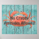 Pavimento de madeira em relevo azul-lacrimogêneo com gráfico de caranguejo vermelho de cor-d-água grande e cobertura de texto "Nenhuma Atitude Permitida"