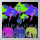 Elefantes neon em fundo negro com nuvens, raios, música e corações.