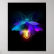 Voz mecânica, antiga, com lâmpada e asas finas brilha cor de laranja, roxo, turquesa sobre fundo preto. Estilo Steampunk.
