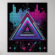 A imagem apresenta um grande triângulo central composto por múltiplas camadas concêntricas em tons de azul, rosa e preto. O triângulo é colocado sobre um fundo escuro com um Sistema de quadrados azuis e cor-de-rosa que se assemelha a um Balancer, acrescentando uma sensação dinâmica e enérgica.