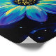 Este vibrante pôster apresenta uma pintura de flor neon com pétalas iridescentes azuis, verde-azulado e roxas e um centro amarelo brilhante em um fundo preto profundo - arte floral moderna.