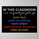Nesta sala de aula respeitamos as pessoas de cada raça, profissão, gênero, filiação política, religião. Negrito e colorido com fundo negro e letras arco-íris para promover a diversidade, igualdade e inclusão de todas as raças e filiações políticas. Excelente maneira de compartilhar uma mensagem de amor e tolerância em sua escola, sala de aula, escritório ou qualquer lugar para promover o pensamento livre e a abertura de espírito, não apenas em palavras, mas em atos.