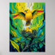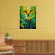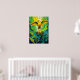 Esta peça deslumbrante apresenta um pássaro canoro dourado retornando ao seu ninho, com as asas estendidas em um abraço protetor acima de dois filhotes. Cercado por folhagem exuberante da selva e faixas de cores que gotejam, combina vida selvagem com arte expressiva. Ideal para amantes de pássaros e fãs de decoração vibrante inspirada na selva.