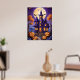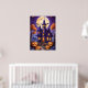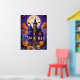 Entra num mundo branco do Halloween com esta ilustração encantadora. Apresentando uma casa assombrada com telhados tortos e silhuetas de morcego esmerilado contra uma lua de cheio brilhante, esta trabalho de arte capta a essência do Halloween. A cena é marcada com árvores nuas adornadas com folhas laranja e quatro abóboras entalhadas com rostos brilhantes, criando um ambiente assustador, mas charmoso. O céu gradiente, em transição de púrpura para laranja, melhora a atmosfera festiva, fazer este poster é uma adição perfeita ao seu decor sazonal.