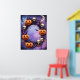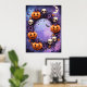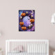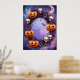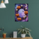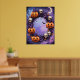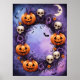 Este poster captivador apresenta um design com o tema do Dia das Bruxas com um arranjo central em forma de coroa de galhos roxos. Dentro desta armação, você encontrará lanternas, crânios e velas fantasmagóricas contra um céu noturno azul e roxo profundo com lua crescente e morcegos voadores. Perfeito por adicionar um toque assustador, mas lúgubre, ao seu decor de Halloween.