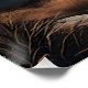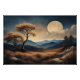 Uma cena noturna mágica com uma lua cheia brilhante iluminando um campo dourado. O contraste entre as árvores amarelas, as montanhas azuis ao fundo e o céu estrelado cria uma atmosfera de paz e mistério.