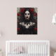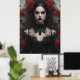 Uma noiva gótica em seu vestido de noiva preto cercado por rosas vermelhas está pronta para seu casamento no dia das bruxas. Arte gerada por IA