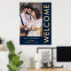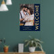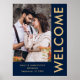 Nomes de Fotos Elegantes Azul Marinho Dourado Bem-vindo Casamento. Totalmente personalizável, personalize facilmente seus nomes e data e altere as cores do fundo e do texto se desejar via opção editar mais.