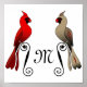 Esta é uma ilustração de um Cardeal Norte par. O passarinho macho é vermelho, com rosto preto, e um bico rosa avermelhado. A fêmea é marrom macio com pistas de vermelho, com um bico vermelho.