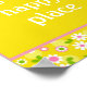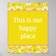 O poster brilhante e ensolarado apresenta um padrão retrô de flores brancas com centros cor-de-rosa e verdes sobre fundo amarelo. Caixa de texto amarela central com texto personalizável "Este é o nosso lugar feliz"
