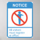 Um sinal que diz para avisar todos os visitantes. Todos os visitantes devem se registrar no escritório. Esta design parece realmente eficaz nestes Poster