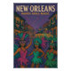 Poster de viagens de Nova Orleans, EUA, celebrando o Carnaval de Mardi Gras. Cena de desfile de rua vibrante com dançarinos vestindo figurinos coloridos, máscaras de carnaval elaboradas e miçangas voando no ar.