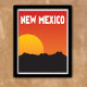 Novo México no estilo poster de viagens vintage com formas simples, cores vibrantes ricas e uma fonte vintage. Uma silhueta de montanha em preto está diante de um enorme sol amarelo com céu vermelho laranja, reminiscente das paisagens da montanha ao redor dos Papais noeis Fe, Taos, ou Albuquerque.