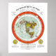 Mapa do globo esticado e achatado em um plano circular. Inclui a calculadora de longitude e hora e diagramas que mostram solas de junho e dezembro. A borda mostra "hora do sol em minutos." Mapa do globo esticado e achatado em um plano circular (projeção azimutal), com dois braços móveis para calcular o tempo em lugares ao redor do mundo.