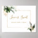 Esta placa de bar de sobremesa de casamento apresenta cor d'água folhagem tropical verde, monstera, folhas de palmeiras, folhas de bananeiras e folhas de ouro falso com uma falso estrutura de retângulo dourado. É perfeito para um casamento tropical, praia ou destino.