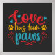 Poster de design de cachorro bonito e colorido com texto vermelho, amarelo e azul com estampas de pata lê Love Has Four Paws! O amante do cachorro vai adorar esse amor fofo... tem quatro poster de cachorro-patas!