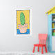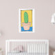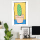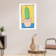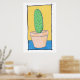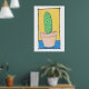 Esta poster tem uma composição simples, desenhada à mão com canetas e aquarela, de um cacto lóbulo de solteiro num pote de flores. O fundo é amarelo e azul, o pote é bege-rosado e o cacto é muito verde e pontiagudo, tudo contido dentro de uma fina borda preta, com um fundo branco. É um exemplo encantador de arte simples, ingênua.