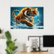O oceano ruge com espuma branca como um tigre majestoso de Bengala atravessa a água rasa, seus poderosos músculos se estendem sob suas distintas faixas laranja e preto. A cena captura o azul vibrante do oceano, a luz solar brilhante, e a energia bruta das ondas esmagadoras. O fundo desfocado do oceano enfatiza a poderosa presença do tigre e sua conexão com a natureza.