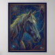 Cartaz de uma cabeça de cavalo em close-up, renderizado com delicadas linhas amarelas, azuis e laranjas em um fundo azul escuro. Fractal vetorial abstrato, função de onda, estilo Zentangle, com sombreamento 3D sutil e elementos bioluminescentes brilhantes. Iluminação cinematográfica, inspirada nos padrões intrincados de Ernst Haeckel e nas linhas fluidas de Alphonse Mucha.