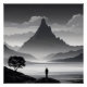 Antes da vastidão, um viajante contempla a ascensão da montanha como guardiã dos céus. Em tons pretos e brancos, a cena revela silêncio, força e introspecção, convidando a reflexão sobre a viagem interior e a busca do inatingível.
