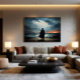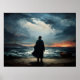 Diante de um mar agitado e um céu dramático, uma figura solitária contempla o desconhecido. O brilho do crepúsculo sugere esperança, enquanto o barco na costa convida a uma jornada.