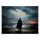 Diante de um mar agitado e um céu dramático, uma figura solitária contempla o desconhecido. O brilho do crepúsculo sugere esperança, enquanto o barco na costa convida a uma jornada.