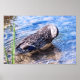 A Mallard Hen está na área rasa de uma lagoa tendendo às suas penas, e fazendo com que as ondulações se movam através da superfície da lagoa em movimento circular. Vocês podem ver o reflexo das nuvens na superfície do lago. E você pode ver através da água limpa e limpa. Copyright Kimberly J Tilley.