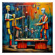 A.I. assistiu a impressão de um surreal e esquisito mestre de marionetes com traços exagerados puxa as cordas de seus marionetes fazer-os a andar e dançar lendo-os para sua performance no palco.