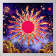 "Fogo Dançante do Cosmos" O Sol. As espirais hipnóticas e as explosões de ouro do Sol dão a ilusão do movimento, como se as chamas solares estivessem vivas. Uma intrincada obra-prima celebrando energia, calor e equilíbrio celeste com cores vermelha, laranja, amarela e azul.