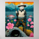 Um trabalho de arte colorido no estilo surreal de um gato pescando