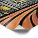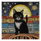 A.I.criou impressão de um céu noturno estrelado e luonado que mostra um gato negro no primeiro plano, colocado contra uma paisagem de edifícios de vilarejos quentes e casas coloridas.