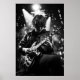 Foto em preto e branco de um jovem músico masculino sentado em palco tocando um violão elétrico durante um concerto. Feito com algoritmos generativos e Photoshop.