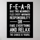 A F.E.A.R. tem dois significados: "Fuja Cada Responsabilidade Encaminhada ou Faça Tudo e Relaxe" - a escolha é sua! Esta design reluzente é uma maneira divertida de reenquadrar o medo e transformá-lo em uma oportunidade de riso ou inspiração. Ideal para qualquer um que desfruta de uma tomada humorística em temas motivacionais, é um lembrete de que os desafios da vida podem ser enfrentados com um pouco de escapismo ou relaxamento. Perfeito para inspiração diária ou como um presente pensativo para aqueles que enfrentam medos com um sorriso.