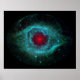 Essa imagem infravermelha do Telescópio Espacial Spitzer da Nasa mostra a nebulosa Helix, uma estrela cósmica muitas vezes fotografada por astrônomos amadores por suas cores vivas e semelhança estranha com um olho gigante. A nebulosa, localizada a cerca de 700 anos-luz da constelação Aquário, pertence a uma classe de objetos chamada nebulosas planetárias. Descobertas no século 18, essas linhagens coloridas foram nomeadas por sua semelhança com planetas gigantes do gás como Júpiter. As nebulosas planetárias são os restos de estrelas que outrora se pareciam muito com o nosso sol. Quando estrelas como o sol morre, elas empurram as camadas gasosas externas. Essas camadas são aquecidas pelo núcleo quente da estrela morto, chamada de anã branca, e brilham com cores infravermelhas e visíveis. Nosso próprio sol vai florescer em uma nebulosa planetária quando morrer em cerca de cinco bilhões de anos. Na visão infravermelha de Spitzer da nebulosa Helix, o olho se parece mais com o de um monstro verde. A luz infravermelha das camadas gasosas externas é representada em azul e verde. A anã branca é visível como um pequeno ponto branco no centro da imagem. A cor vermelha no meio do olho denota as camadas finais de gás queimadas quando a estrela morreu. O círculo vermelho mais claro no centro é o brilho de um disco empoeirado circulando a anã branca (o disco em si é muito pequeno para ser resolvido). Essa poeira, descoberta pela visão infravermelha de Spitzer, que buscava calor, foi provavelmente chutada por cometas que sobreviveram à morte de sua estrela. Antes de a estrela morrer, seus cometas e possivelmente planetas teriam orbitado a estrela de forma ordenada. Mas quando a estrela explodiu suas camadas externas, os corpos gelados e os planetas externos teriam sido jogados uns contra os outros, resultando em uma tempestade de poeira cósmica contínua. Qualquer planeta interior do sistema teria se queimado ou sido engolido à medida que sua estrela morrendo se expandia. Até agora, a nebulosa Helix é um de apenas alguns sistemas de morto-estrela nos quais foram encontradas evidências para sobreviventes de cometas. Esta imagem é feita de dados da câmera de matriz infravermelha do Spitzer e do fotômetro de imagens multibanda. O azul mostra luz infravermelha de 3,6 a 4,5 mícrons; o verde mostra luz infravermelha de 5,8 a 8 mícrons; e o vermelho mostra luz infravermelha de 24 mícrons.