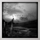 Em pé no campo da montanha à noite. Debruçando-se sobre uma cerca de madeira rústica e meteorizada. Sobre as árvores, um bando de gansos canadenses no sul voando em forma de fevron antes de uma lua de cheio. O verão acabou. Fotografia da paisagem branca e negra por Bob Orsillo