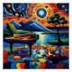 A.I.assistiu impressão de uma paisagem surreal vibrante mostra um piano de cauda esperando seu pianista, colocado em um campo colorido, com padrão geométrico. O céu está repleto de círculos giratórios que se assemelham a uma noite estrelada, e a cena está rodeada por um verde exuberante e um rio sereno.